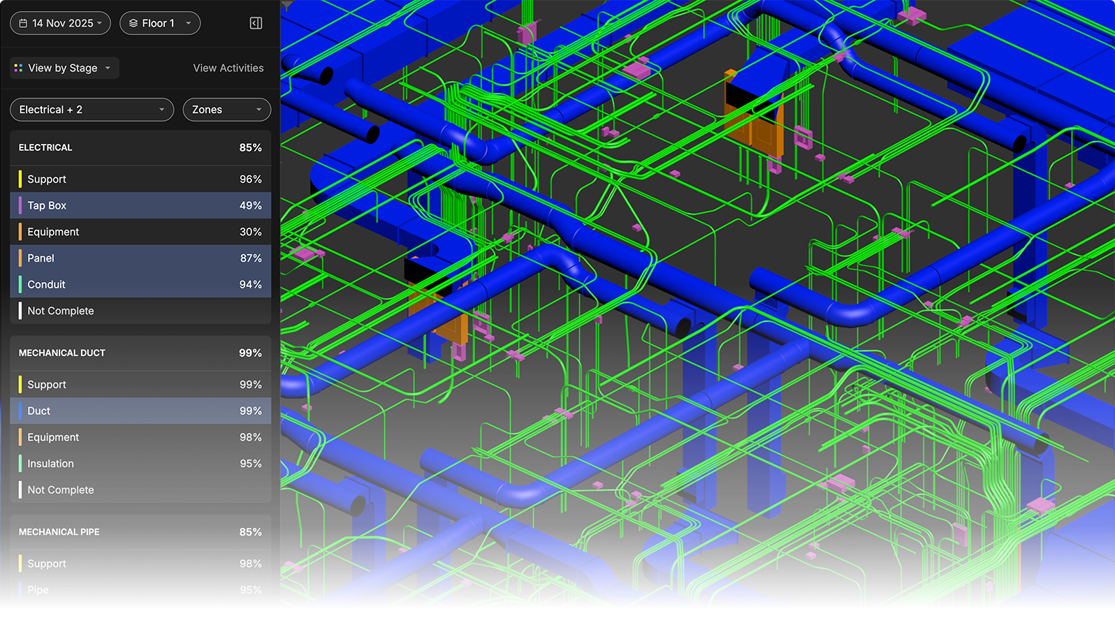 Everything you need—schedule, systems, stage—overlaid in one intuitive model view.